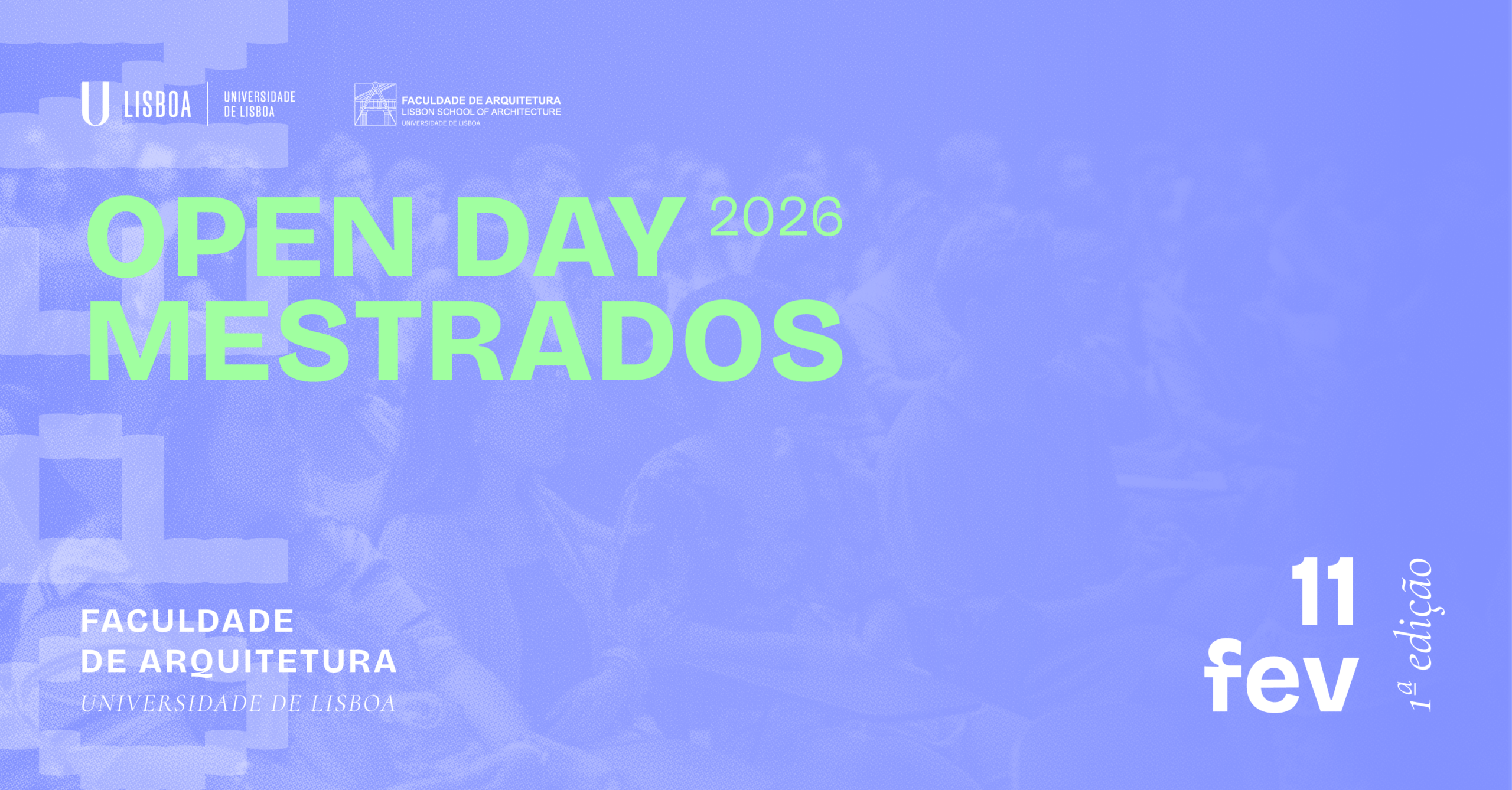 É — a 11 de fevereiro — que o Auditório Rainha Sonja da Noruega — localizado na Faculdade de Arquitetura da Universidade de Lisboa (FA.ULisboa) — será palco de um Open Day de Mestrados — a partir das 14:00 horas —, que promete muito mais do que uma visita, viabilizando um encontro único de conhecimento, criatividade e inovação, onde ideias ganham forma.